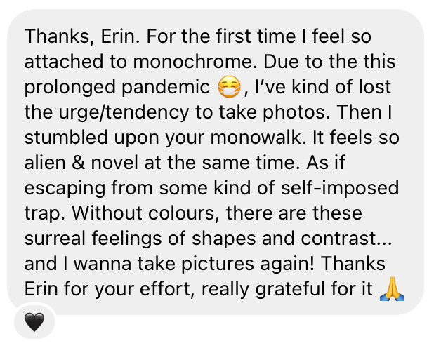 So much good to respond to here. Past Present Future. My favorite aspect of your Monowalks is the black & white. Looking forward to your Spotify playlist today. Your self-awareness (along with the passion and dedication) is refreshing.